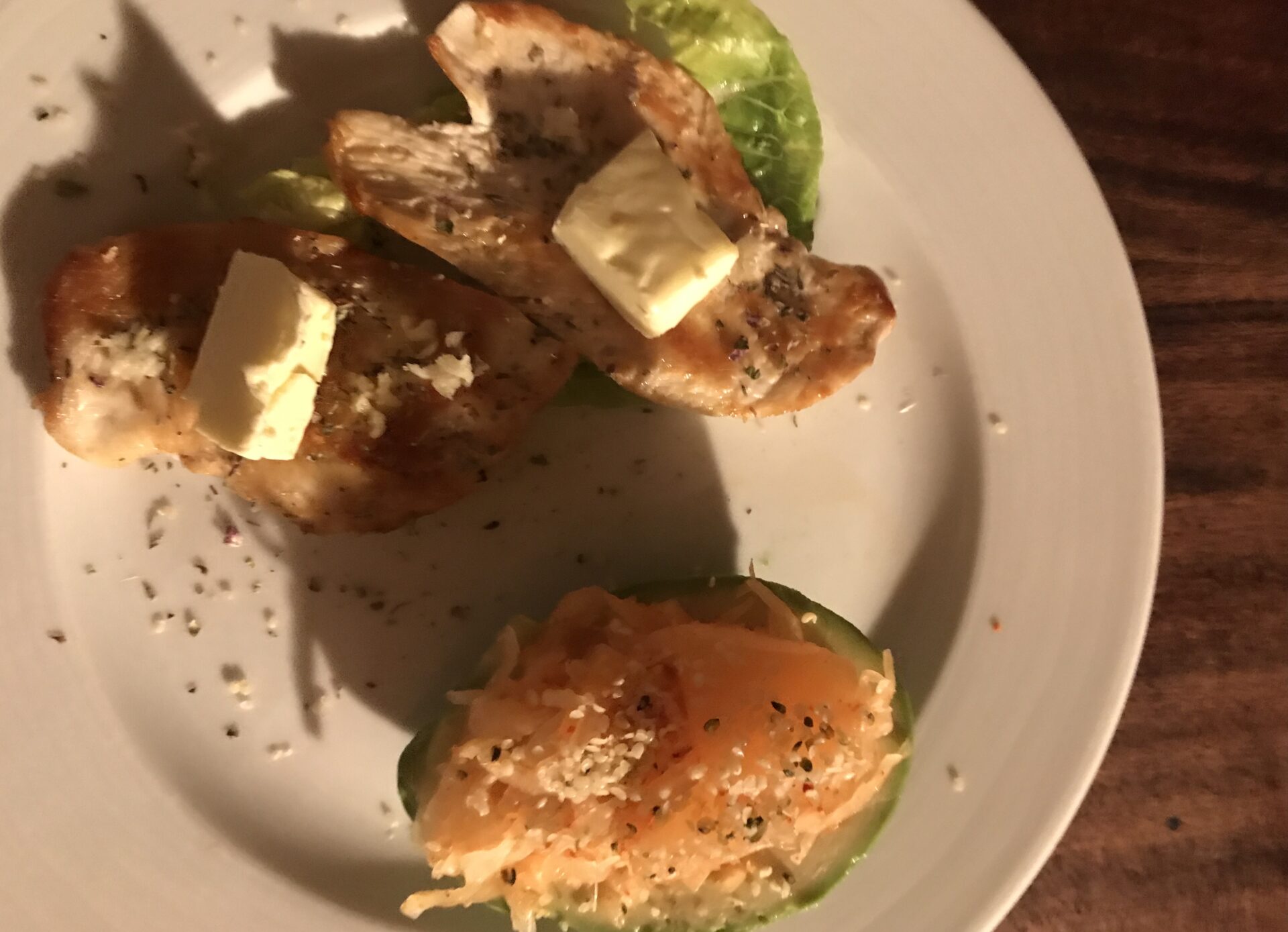 Das erste „richtige“ Essen, eine Stunde später, ist eine Avocado mit Kimchi-Sauerkraut und entweder ein halbes irisches Rindersteak oder Hähnchenbrust.