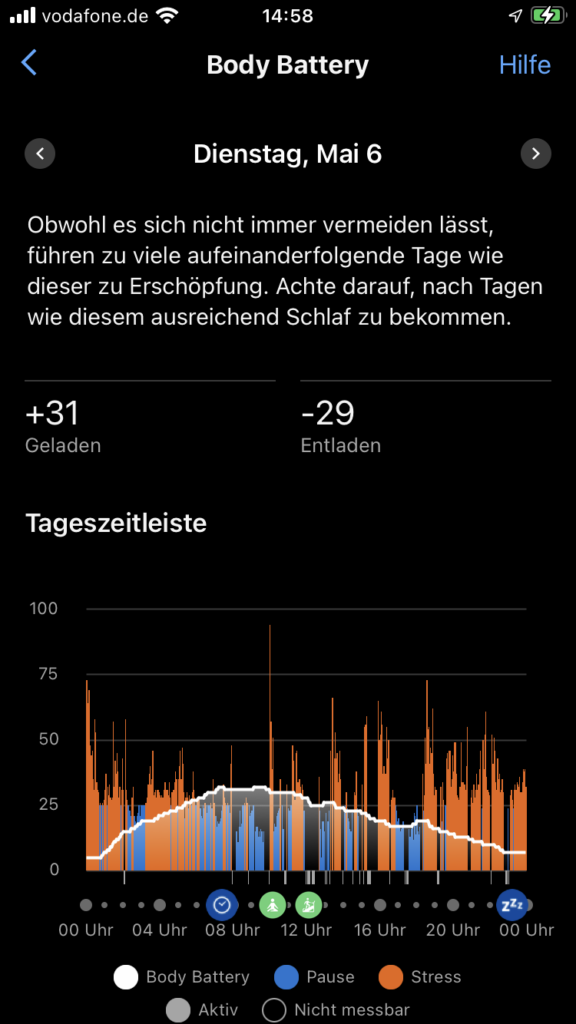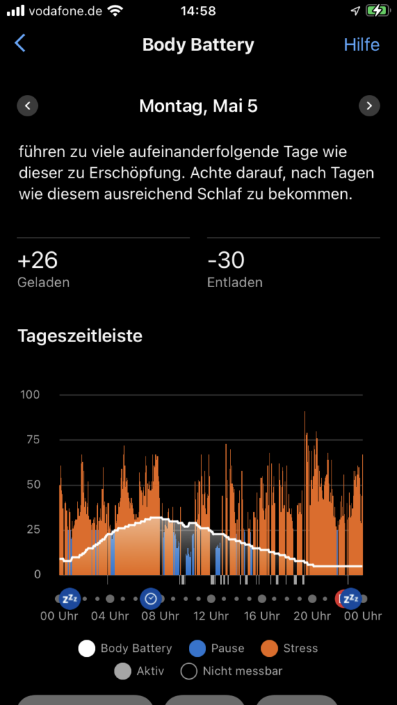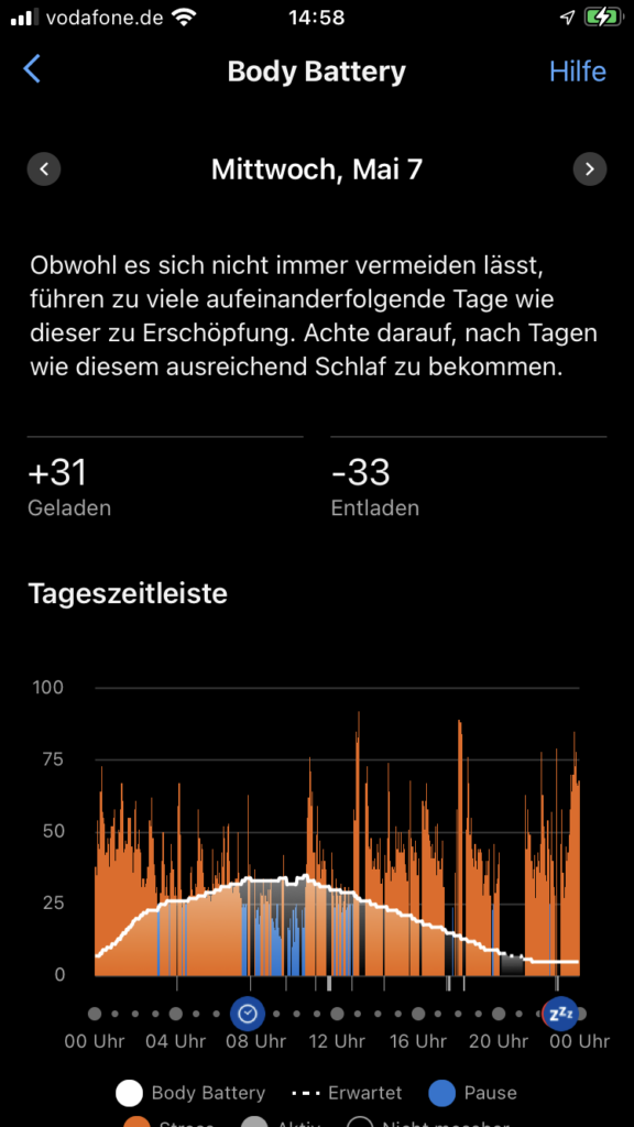 Insgesamt wird an den Fastentagen mein physisches Stresslevel runtergefahren, der Puls ist niedriger und die Body Battery fällt langsamer oder steigt über Nacht sogar etwas mehr.