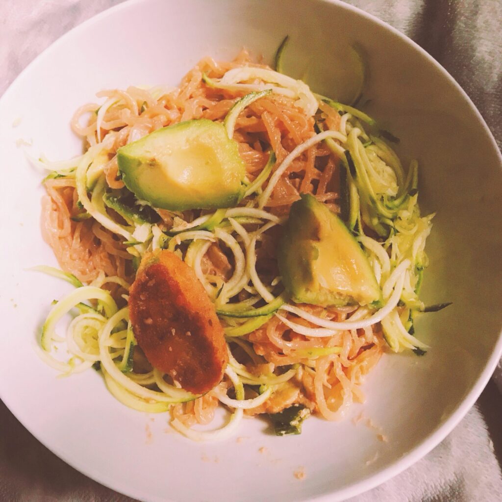 Bei uns meistens Erdnuss-Nudeln (Shirataki) mit veggie Nuggets. Oder Nudeln mit Chili-Öl.